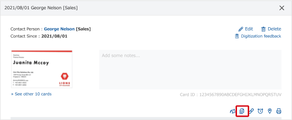 1. Open up the Business card detail screen of the card you would like to copy, at from the bottom of the memo column, click on the "Copy Data" icon.
