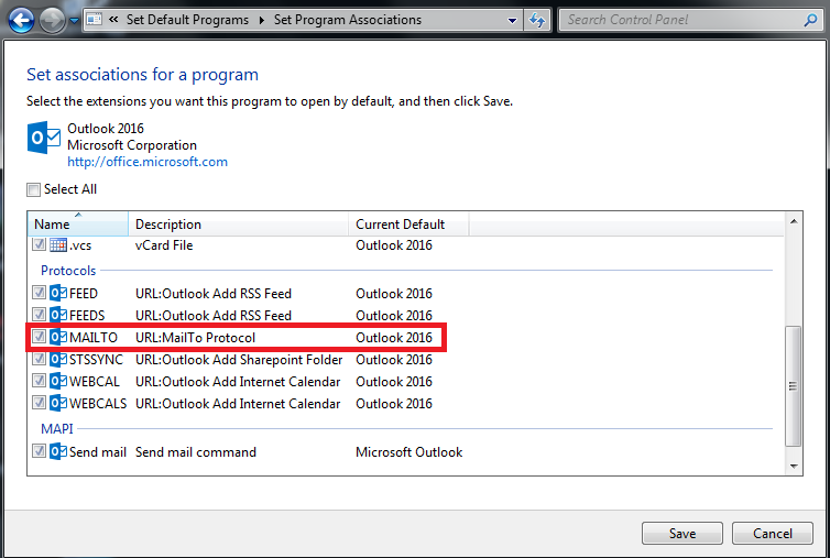 5. From the screen for setting program associations, under "Protocol" put a check next to "MAILTO", and then click on "Save".