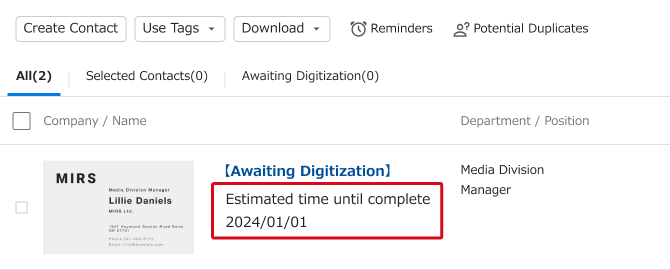 If more than 20 cards are scanned in a day, the 21st and following cards may not be digitized on the next business day. The scheduled date is determined by the number of cards scanned by all Sansan user companies. In especially busy times, this may even take several weeks.