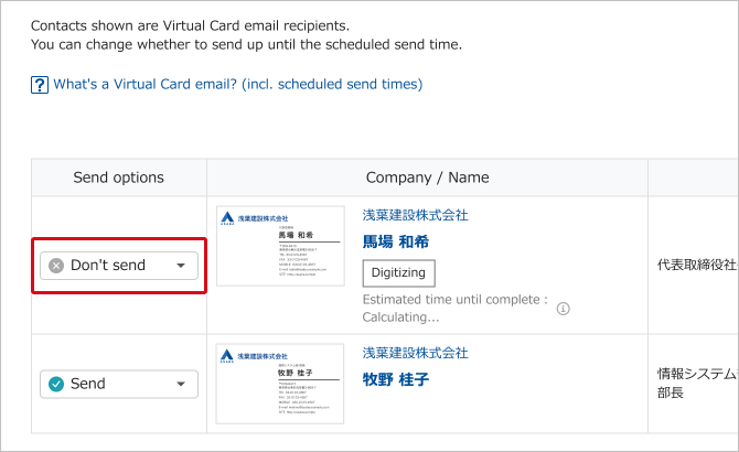 Virtual Card emails are automatically sent the morning after a contact is added into Sansan. You can set for them to not be sent to specific contacts.