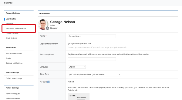 You can use two-factor authentication for logging into Sansan to strengthen the account security. Even if the password to the account has been leaked or stolen, unauthorized entrance by third parties can be prevented with two-factor authentication.