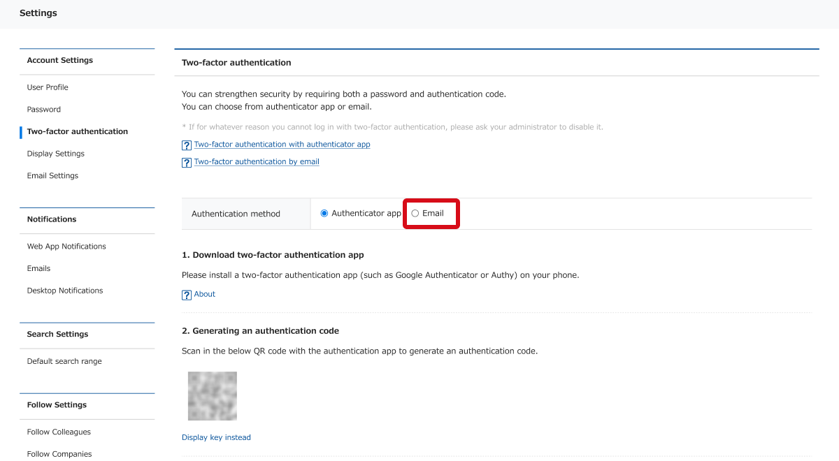 If a user cannot obtain the authentication code for any reason, such as not receiving the email containing the authentication code, the Sansan system administrator can disable two-factor authentication for that user.