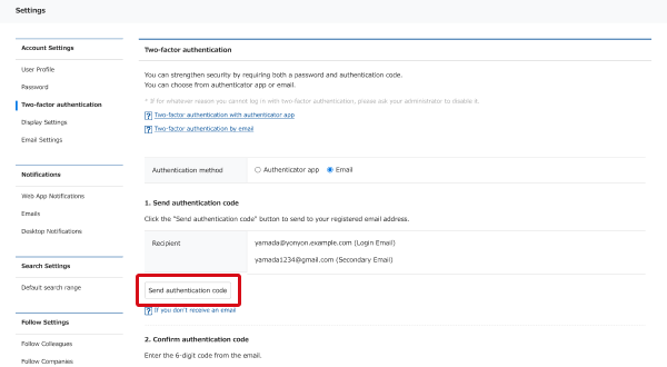 When you click the "Send authentication code" button, an authentication code will be sent by email. The email will be sent to your login email and, if set up, your secondary email.