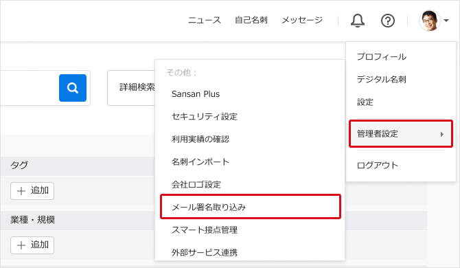 - [管理者設定]から[メール署名取り込み]をクリックします。