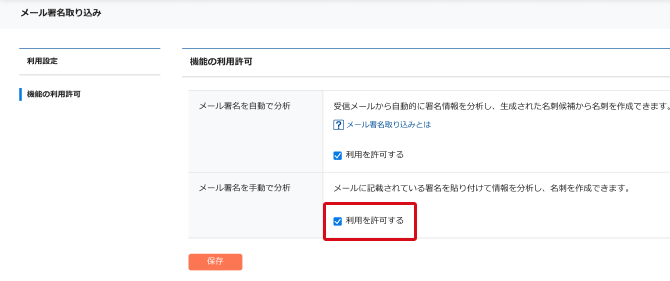 - 利用設定の「機能の利用許可」内「メール署名を手動で分析」の利用を許可するチェックを外すと利用解除できます。