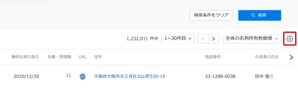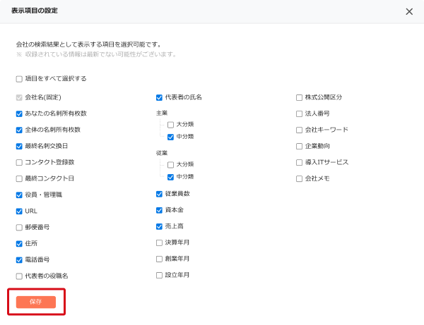 企業DBの表示項目を変更する 企業DB画面で表示する一覧の項目を入れ替えることができます。 本機能はスマートフォンアプリでは利用できません。 一覧の項目を入れ替える 1. 一覧の右端にあるアイコンをクリックします。 2. 一覧に表示したい項目のチェックボックスをONにして、[保存]をクリックします。 利用可能な項目 項目の詳細はこちらをご確認ください。 この記事は役に立ちましたか? 貴重なご意見をお寄せいただきありがとうございます。 問題が解決しない場合はAIチャットでもサポートさせていただきます AIチャットでお問い合わせ