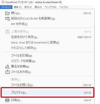 1.PDFファイルを開き、「ファイル」メニュー→「プロパティ」を選択。