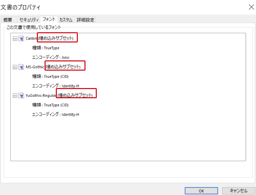 2.「フォント」タブで、全てのフォント名の右側に「(埋め込みサブセット)」と表示されていることを確認。