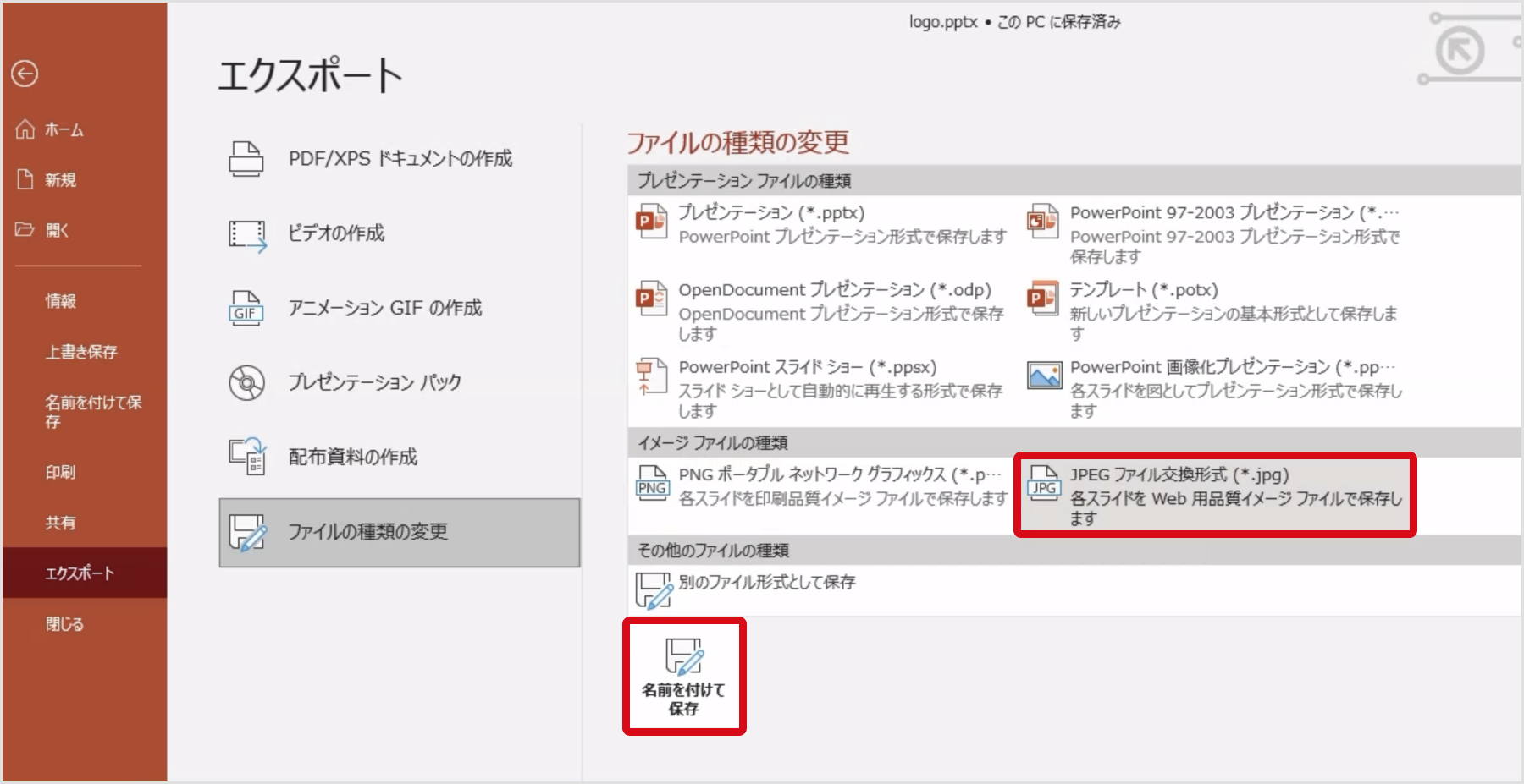 [名前をつけて保存]をクリックし、保存。