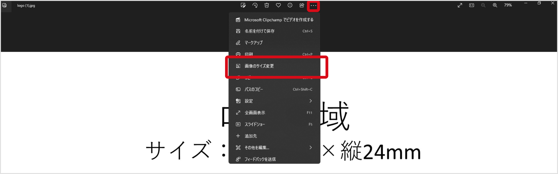 2.保存したjpegファイルを Microsoft Photos で開き、[…]>[画像のサイズを変更]をクリック。