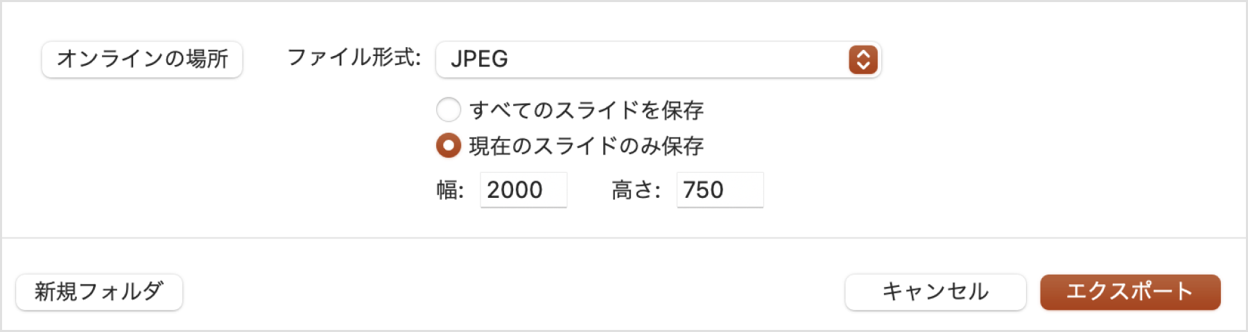 2.ファイル形式:JPEG、幅:2000、高さ:750に変更し、[エクスポート]をクリック