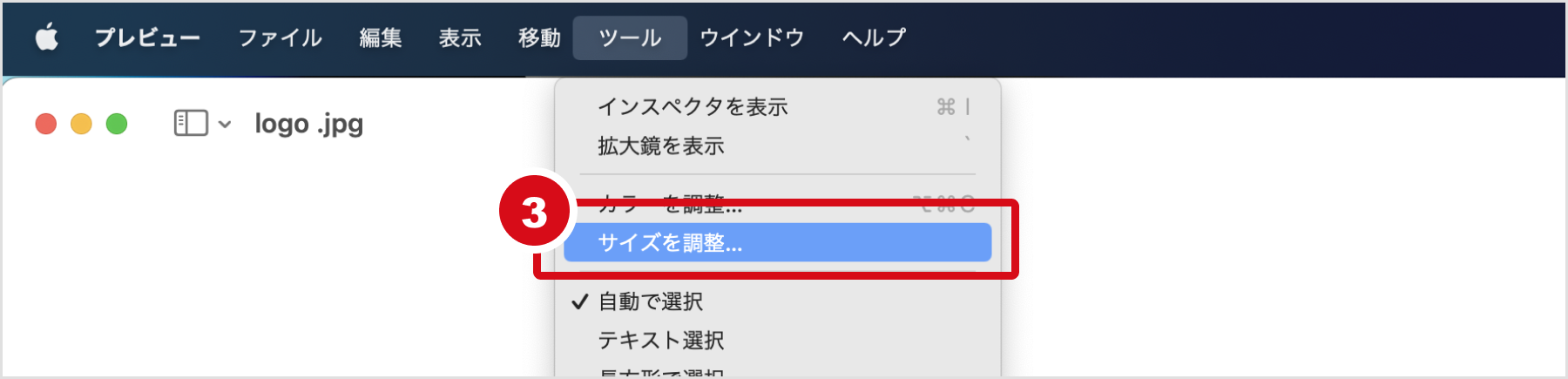 3.保存したjpegファイルをプレビューで開き、[ツール]>[サイズを調整]をクリック