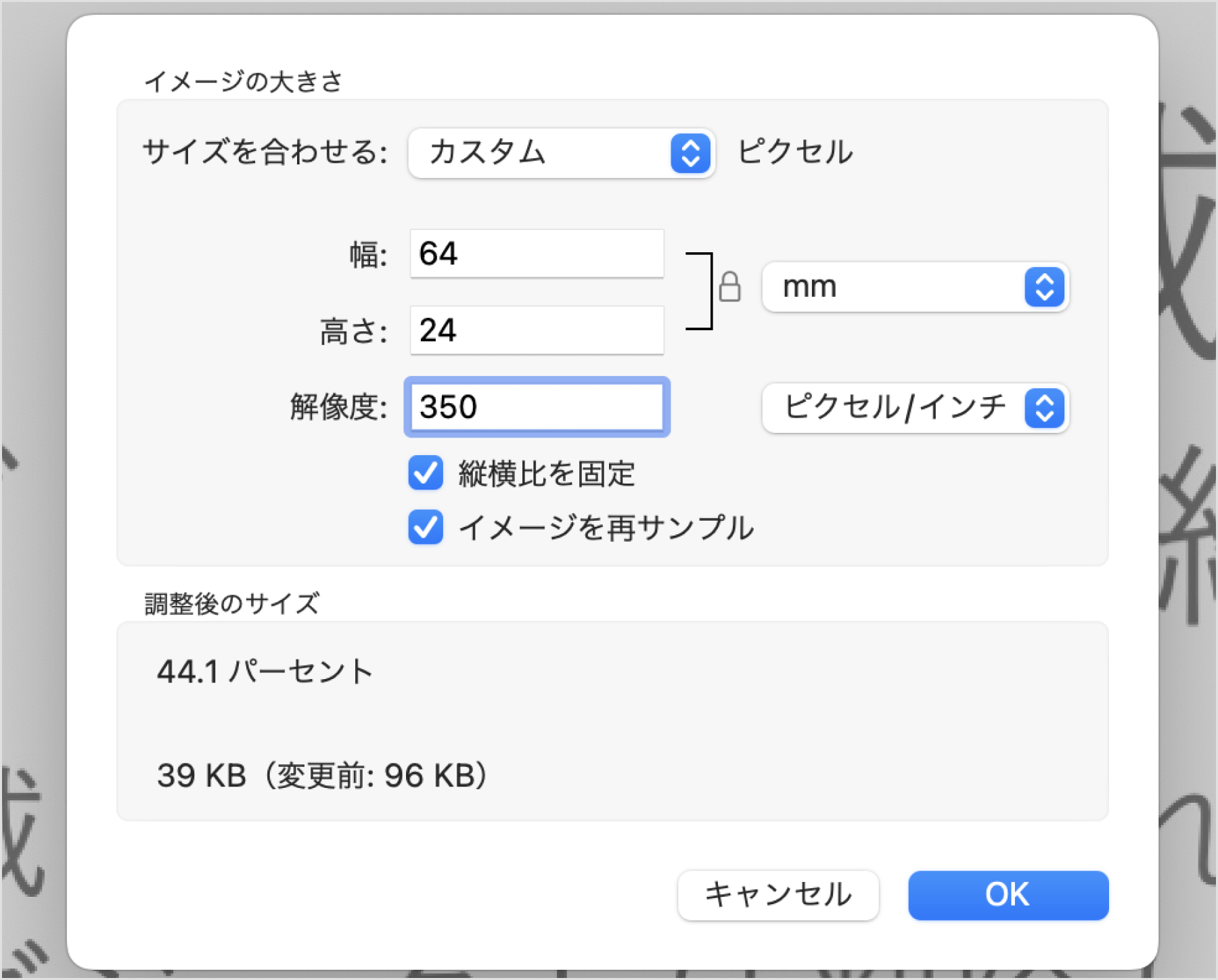 4.幅:64mm、高さ:24mm、解像度:350ピクセル/インチに設定し、[OK]をクリック
