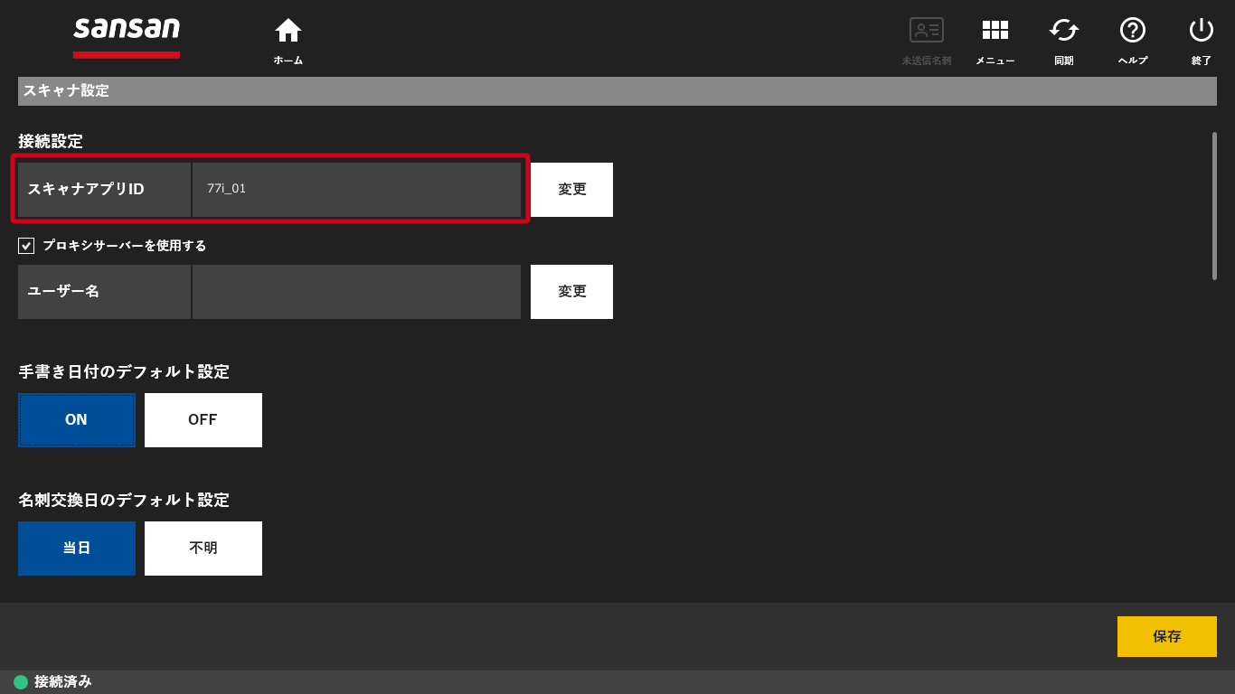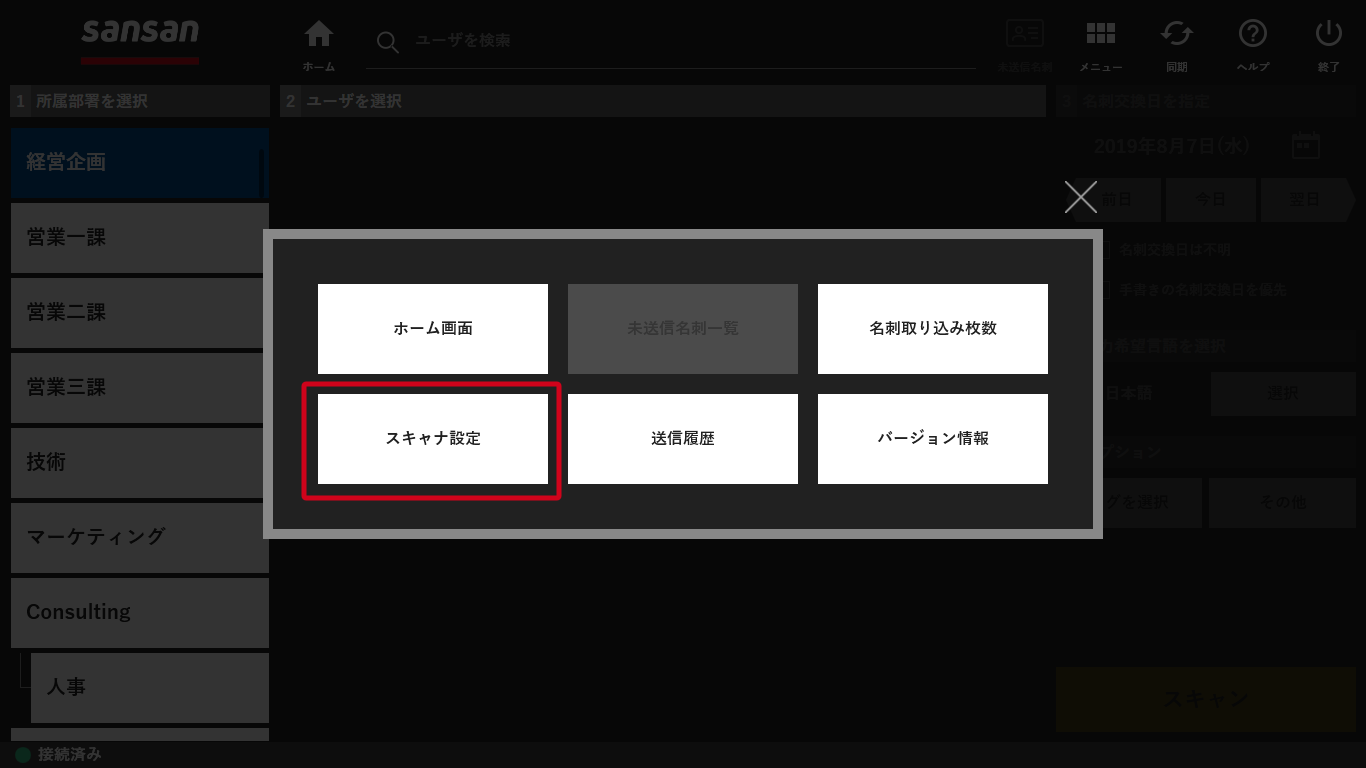 1. 表示部署を変更する Sansanスキャナ (タブレットPC) にて、画面右上の [メニュー] > [スキャナ設定] をタッチし、[スキャナアプリID] の下2桁を確認します。