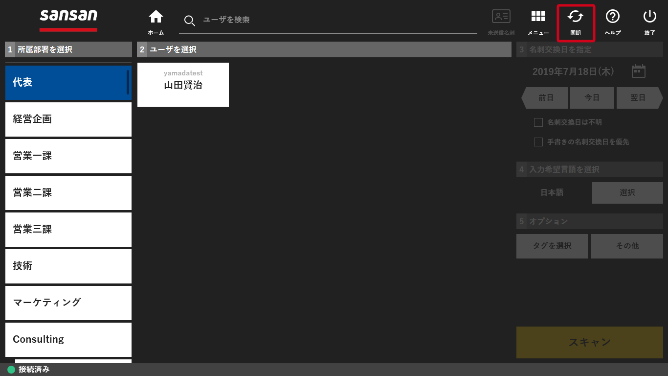 5. 対象 Sansanスキャナ画面右上の [同期] をタッチします。変更内容が反映されます。