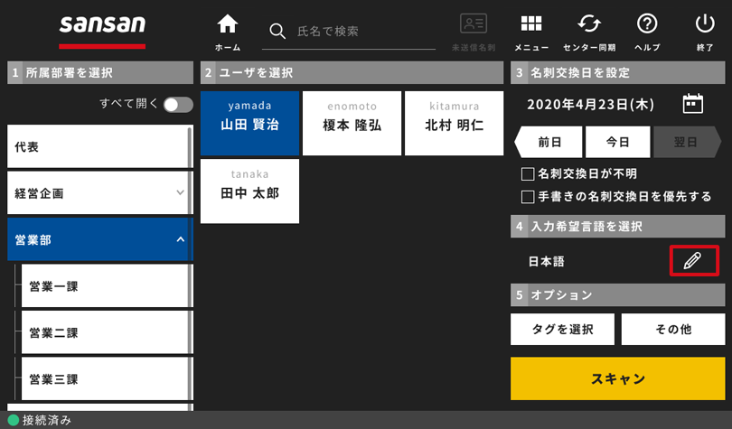 タブレットPCとスキャナのセットアップが完了したら、早速名刺をスキャンしましょう。Sansanを活用するためにはまず名刺をデータ化することが重要です。名刺をもらったらまずスキャンする習慣を身につけましょう。名刺スキャンの手順についてご案内します。