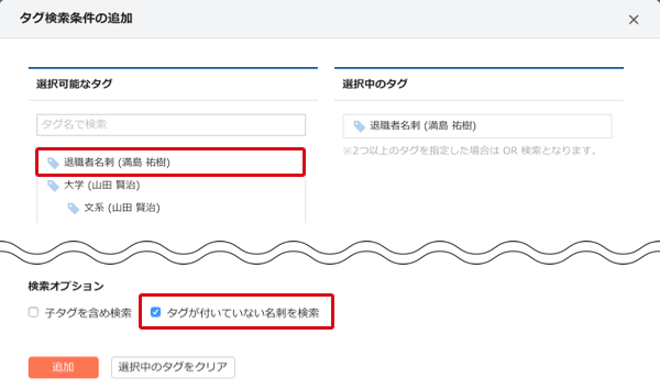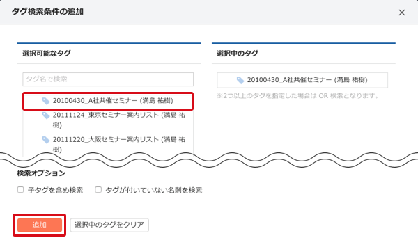 タグB(例:02. 営業部長リスト)を選択します。選択したタグのどれかが[付いていない]を選択し、[追加]をクリックします。
