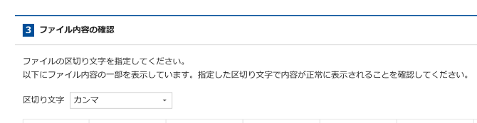 ファイルの先頭の数行が表示されます。ファイルの内容や区切り文字の指定に問題がないか確認してください。