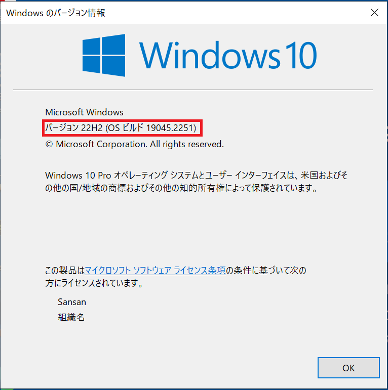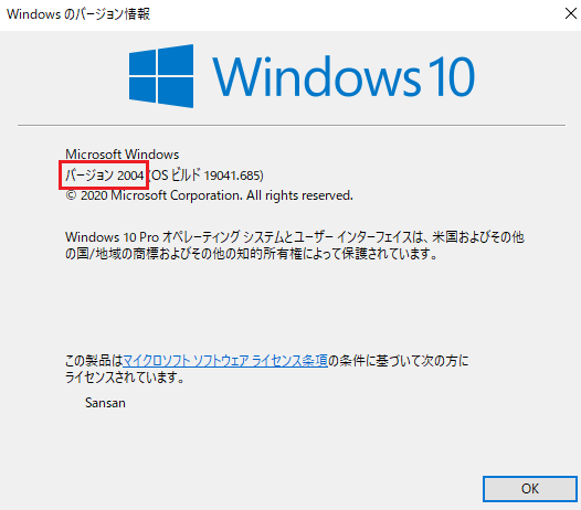 「バージョン 21H2」もしくはそれ以前(2004、1909など)のバージョンが表示されていることを確認してください。