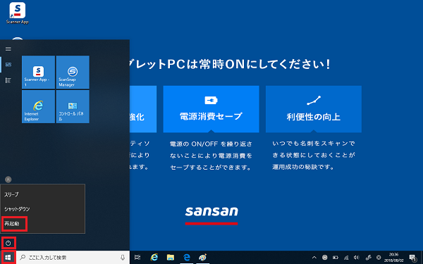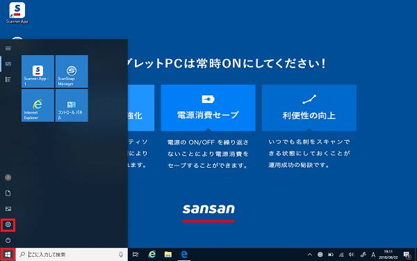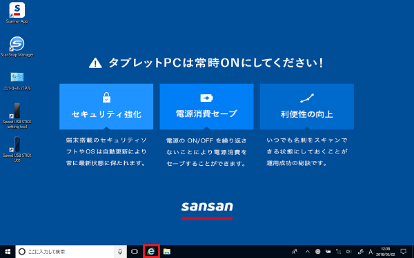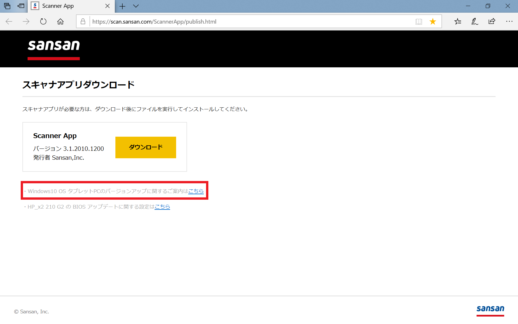 - 対象は Windows 10 OS の Sansanスキャナ(タブレットPC)機器です。Windows 8.1 OSの機器をご利用の場合は交換対応いたしますのでサポートセンターまでお問い合わせください。