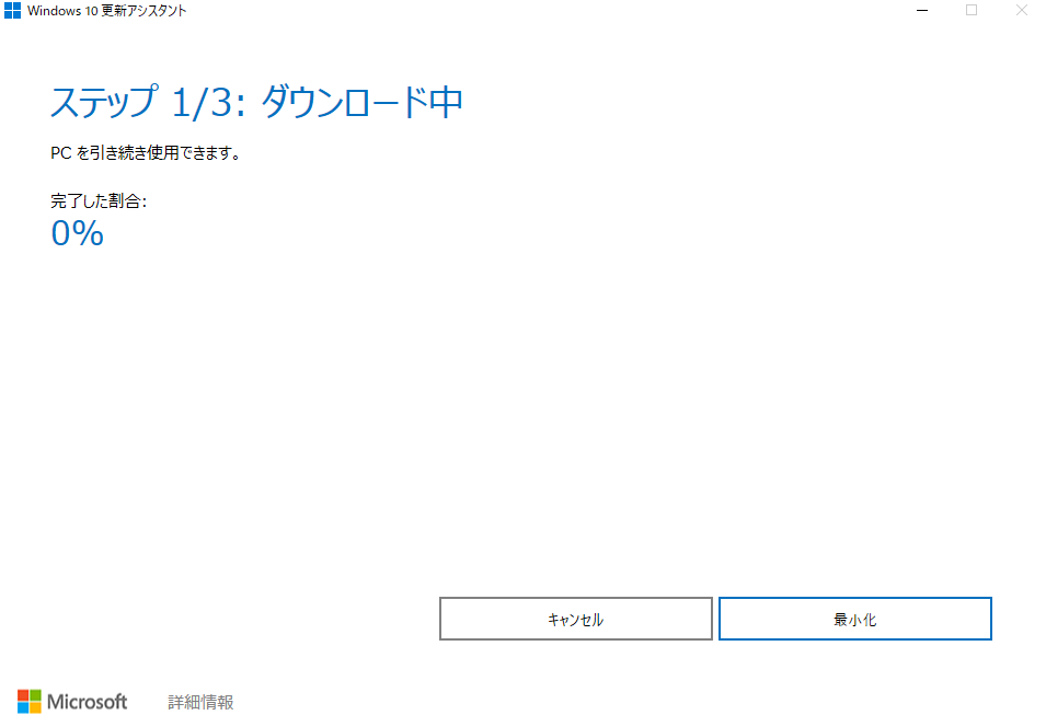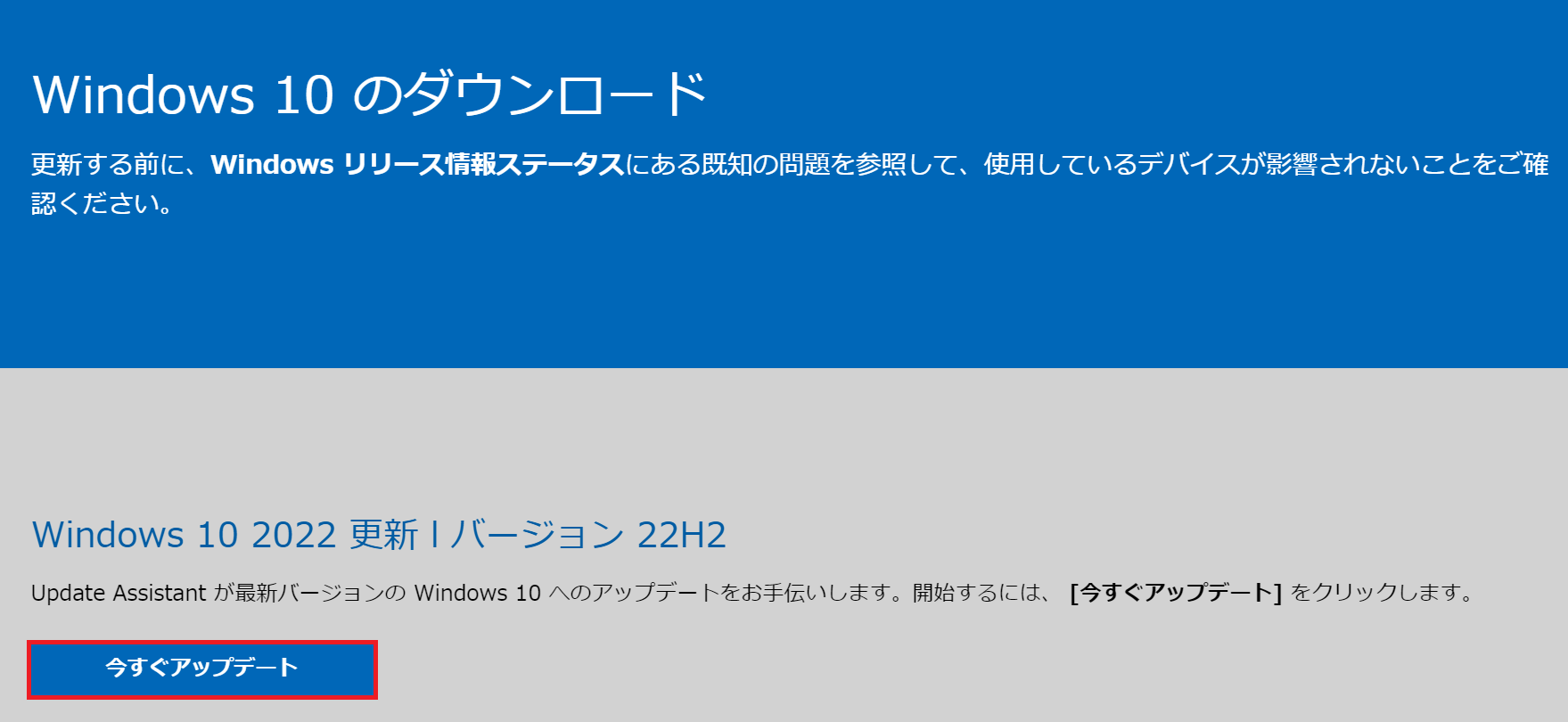 Windows 10 の最新バージョンへの更新(Update to the latest version of Windows 10)と表示されますので、ページ内の「今すぐ更新 / Update Now」ボタンをクリックし、そのまましばらく待ちます。