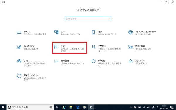 13. [Windowsの設定]画面にて[アプリ]をタッチします。