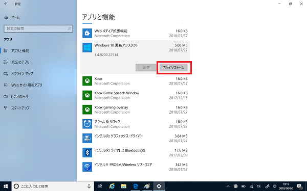 14. [アプリと機能]画面にて、「Windows 10 更新アシスタント」の「アンインストール」ボタンをタッチします。