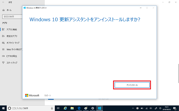 17. Windows 10 更新アシスタント画面が表示され、「Windows 10 更新アシスタントをアンインストールしますか?」と表示されるので、「アンインストール」ボタンをタッチします。