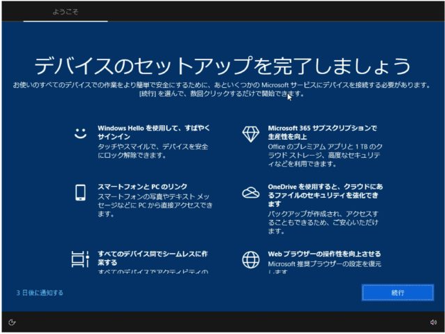 アップデート適用後、PC再起動時に「デバイスのセットアップを完了しましょう」という画面が表示される場合