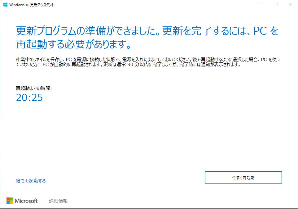 9. 更新が完了すると、「Windows 10を更新するには、PCを再起動する必要があります。」(Your update is ready. Your PC needs to restart to complete the update.)と表示されます。30分後にPCの再起動が行われます。