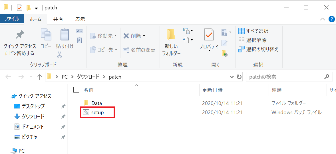(6) 展開した patch フォルダが表示されます。patch フォルダ内の setup.bat をタッチして選択してから長押しし、右クリックメニューが表示されたら、「管理者として実行」をタッチします。