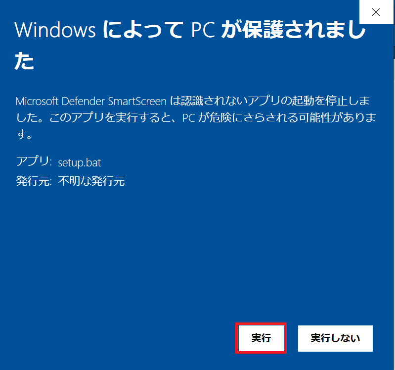 「アプリ:setup.bat 発行元:不明な発行元」と表示されますので、「実行」をタッチします。