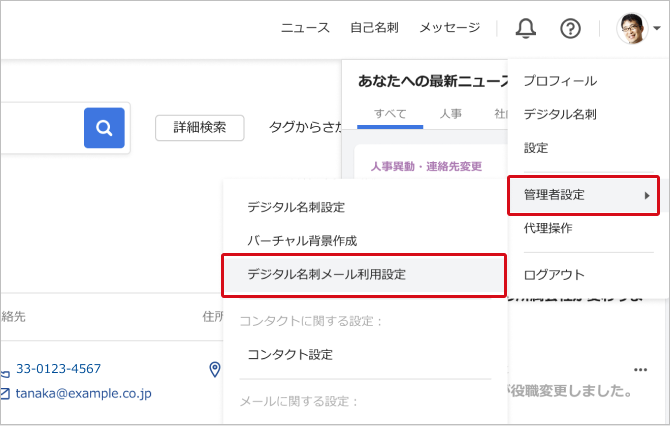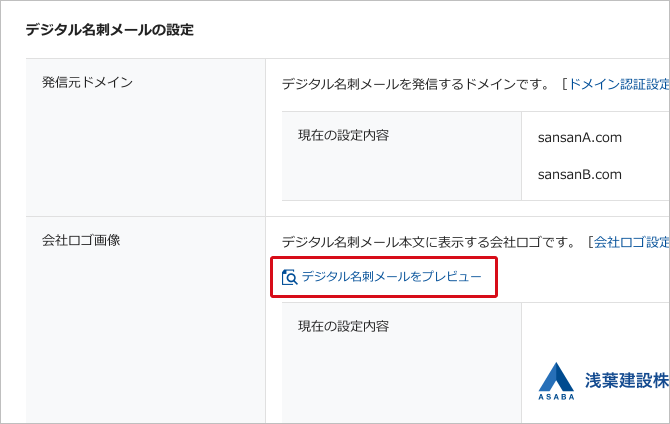 利用するためには、管理者が機能の有効化を行い、デジタル名刺メールの設定(発信元のドメイン設定、会社ロゴの設定)を完了させる必要があります。