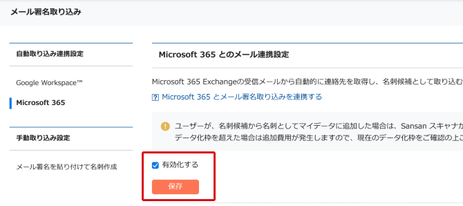 テナント IDの登録後、右上のユーザーアイコン >[管理者設定]>[メール署名取り込み]に戻り、[有効化する]にチェックし[保存]をクリックします。機能の有効化をお知らせする管理者メールが届きます。