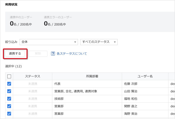 [利用状況]の絞り込みで、登録したいユーザーを指定し、チェックボックスで選択します。[連携する]を選択すると、連携が開始されます。