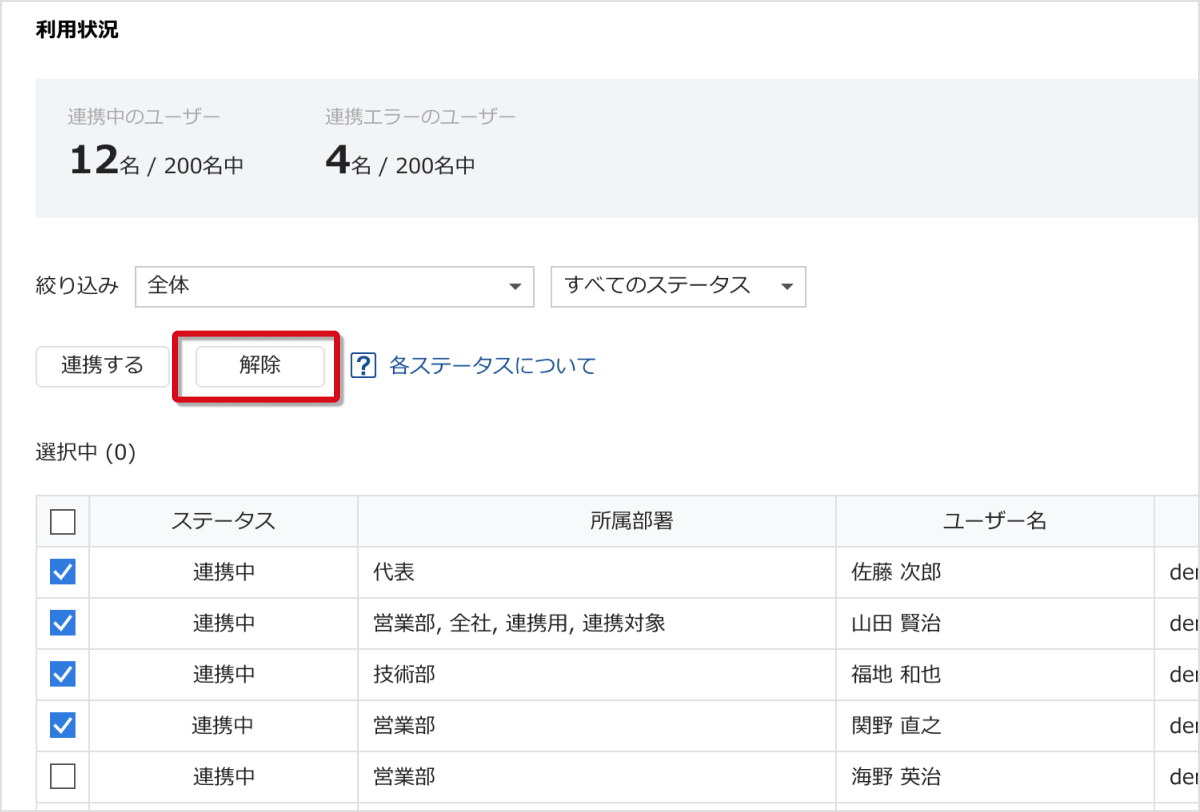 連携解除をしたいユーザーを指定し、[解除] を選択してください。