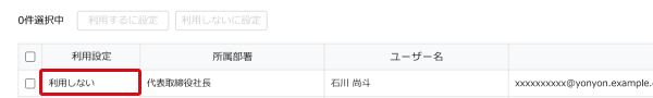 4. 「利用しない」に設定したいユーザーがいる場合は、対象のユーザーを選択して[利用しないに設定]をクリックしてください。