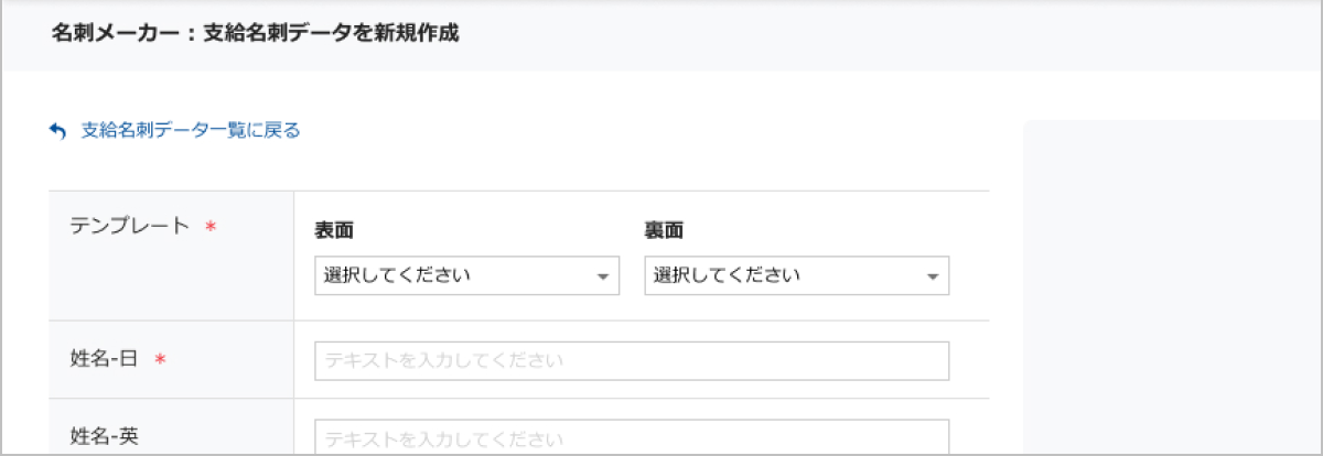 2. [支給名刺データを新規作成] 画面で必要な情報を入力します。「テンプレート」「姓名-日」は必須項目です。