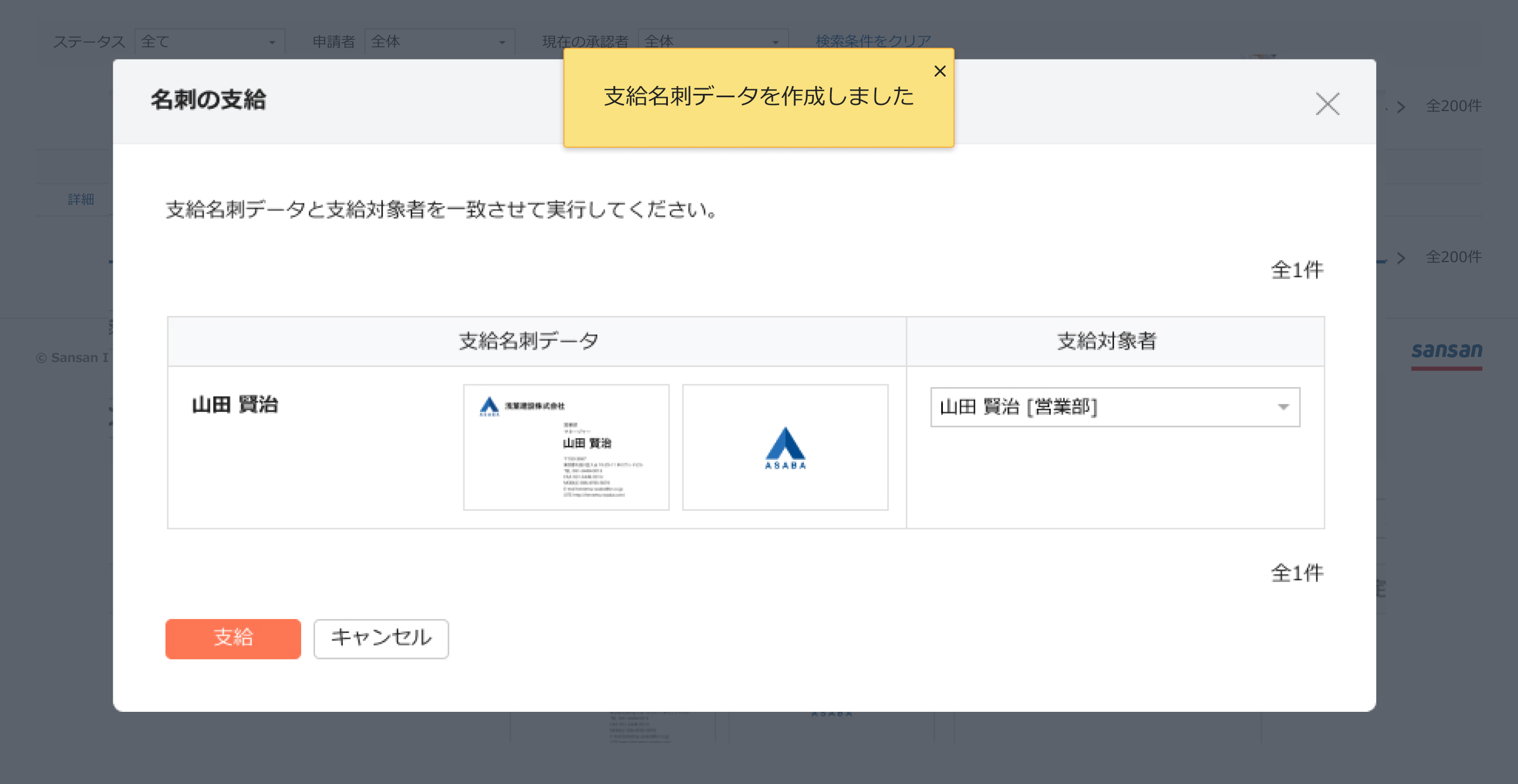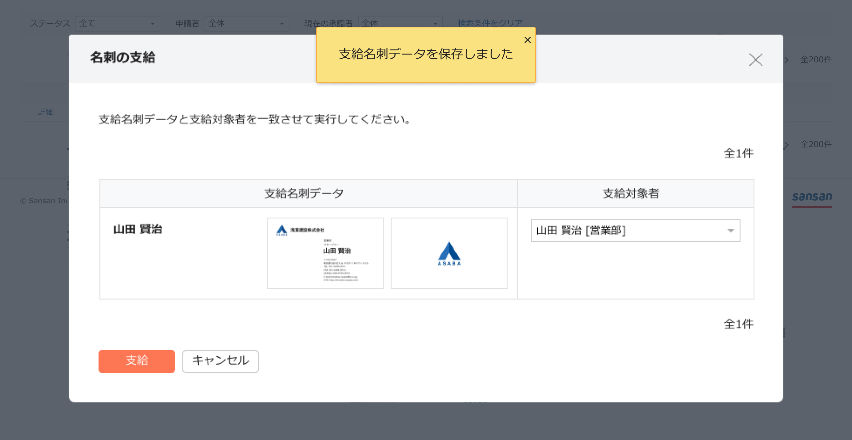 Sansanのログインメールアドレスを指定した場合、支給対象者の選択画面でユーザーとして反映されます。 ※ログインメールアドレスと一致しないメールアドレスを指定した場合、支給対象者は反映できないため、「未設定」となります。 |