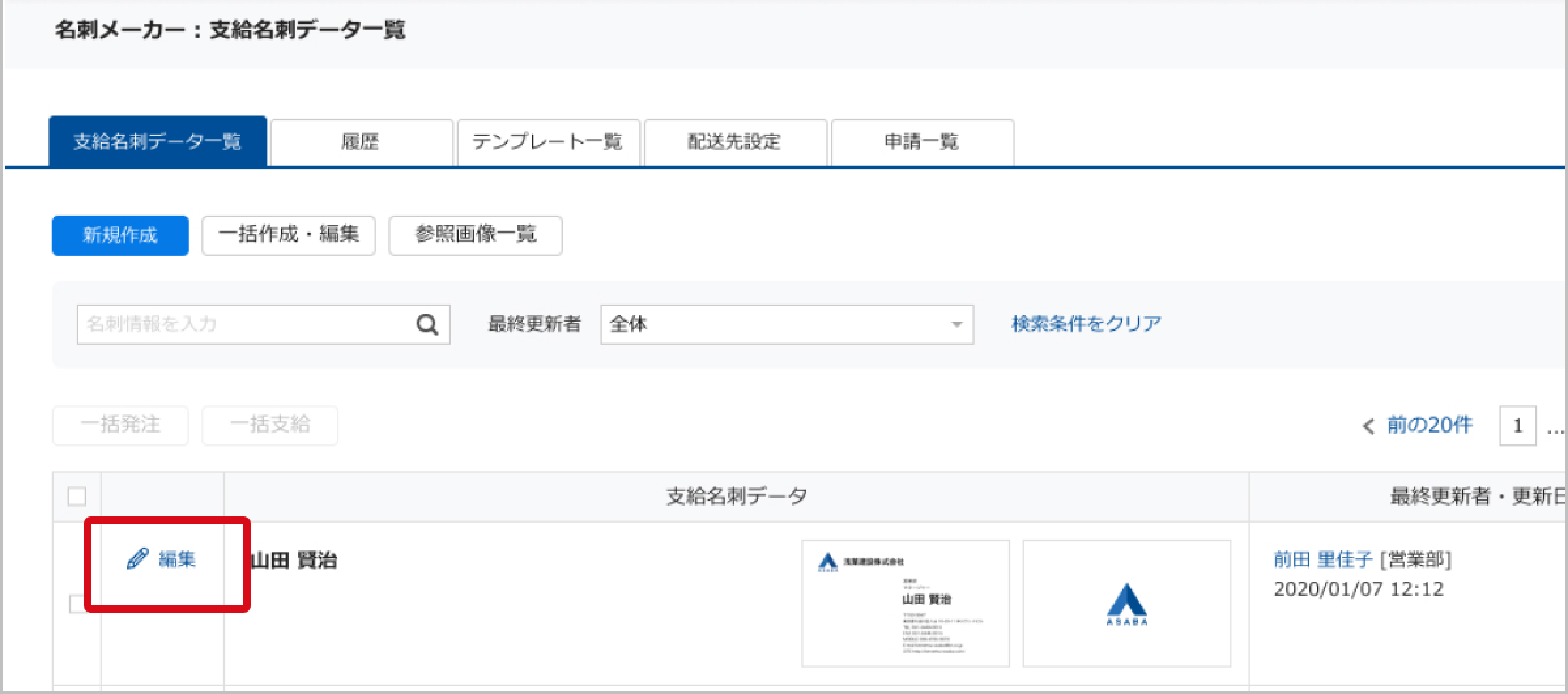 1. 名刺メーカー画面の [支給名刺データ一覧] より [編集] をクリックします。