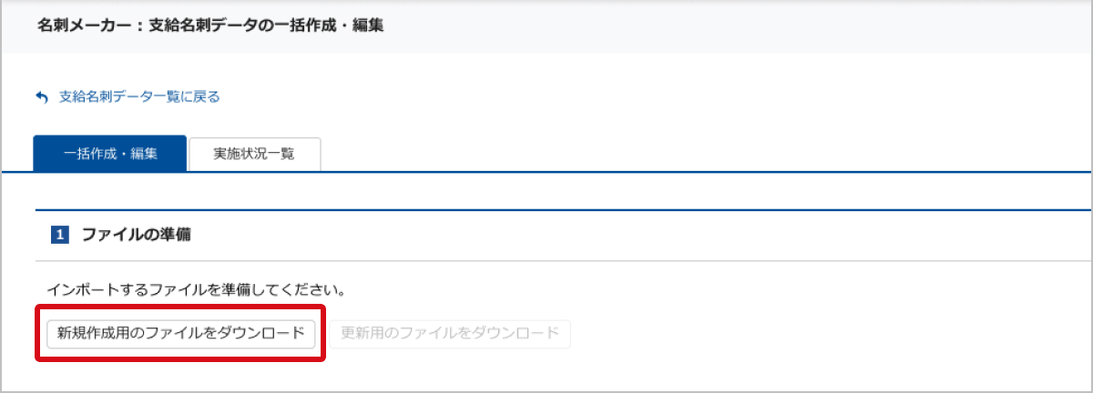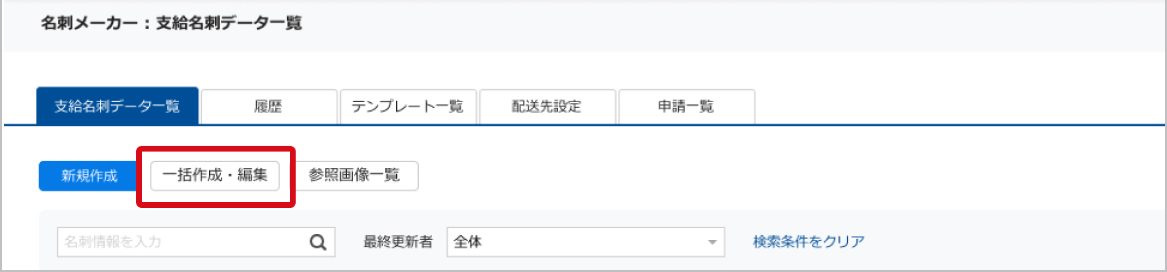 1. 名刺メーカー画面の [支給名刺データ一覧] より [一括作成・編集] ボタンをクリックします。