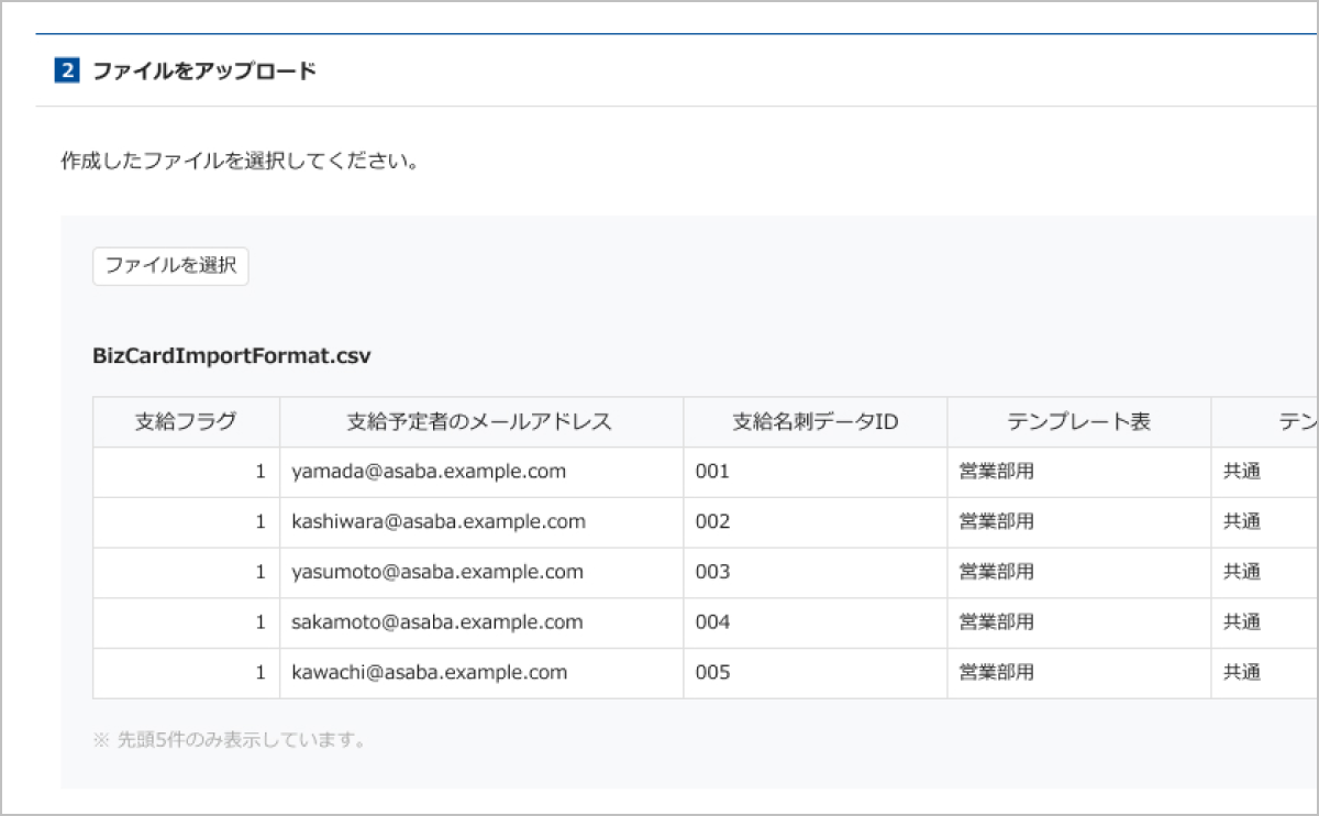 | 支給名刺データID | 支給名刺データを更新する際に必要なIDです。 [更新用のファイルをダウンロード] から取得したCSVファイルに入力されています。変更せずアップロードしてください。 新規作成の場合は空白のままアップロードしてください。 |