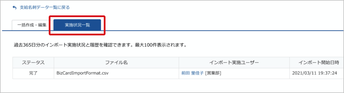 6. インポートの実施状況は [実施状況一覧] に表示されます。開始直後のステータスは [処理開始待ち] です。