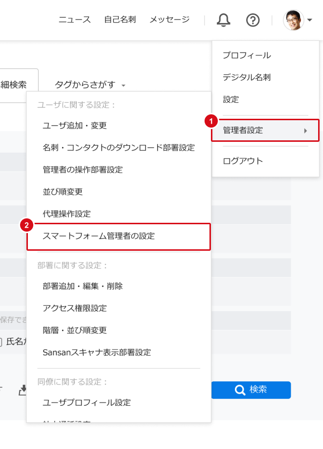 Sansanにログインし、画面右上のメニューより [スマートフォーム管理者の設定]をクリックしてください。