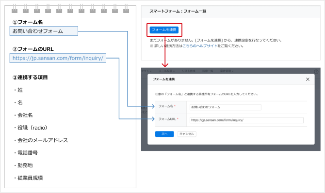 続けて、[フォームを連携] をクリックし、表示されたダイアログ上に、STEP1で控えたフォーム名とフォームのURLを入力後、[次へ] をクリックしてください。