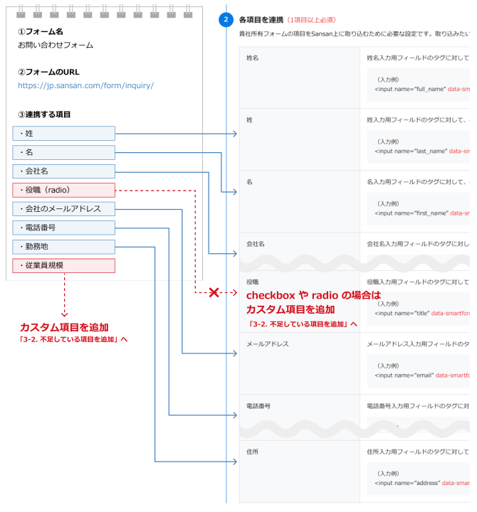 連携する項目がすべて揃っていれば、STEP2の作業は完了です。 STEP3に進み、各項目の右側に表示されているコードを、連携するフォームのHTMLに追加します。