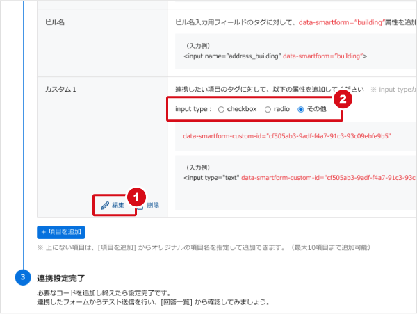 項目名は、以下の「①編集」より任意の名称に変更可能です。また、該当項目のデータ形式がcheckboxもしくはradioの場合は「②input type」を変更します。これら以外のデータ形式の場合は「その他」のままとしてください。
