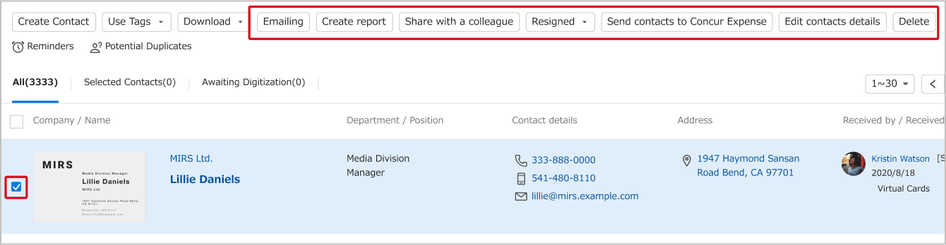 If you select a business card, icons for "Edit Contact Details" and "Delete" will be displayed.