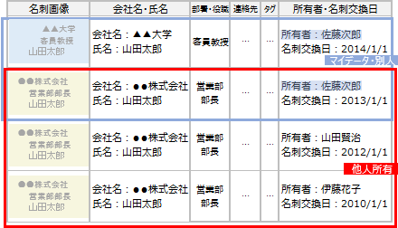 在人物详情界面上,可以看到按人物ID整理的相同人物的名片。可以从经历中确认人物的经历。按照名片交换日期时间倒序排列。 |